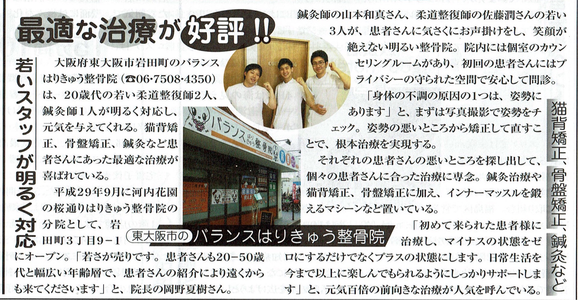 東大阪若江岩田にある整骨院、バランスはりきゅう整骨院が新聞で取り上げてもらえました!!